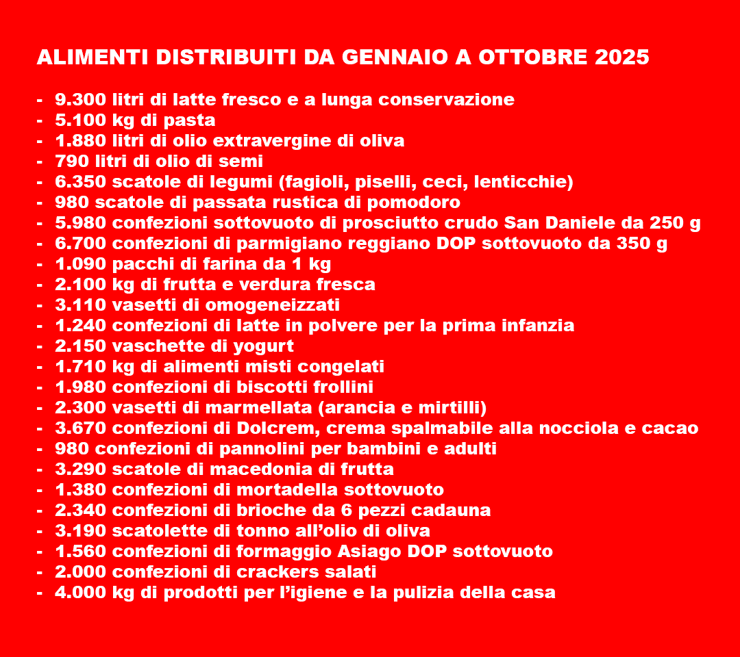 - Distribuito 450 pacchi viveri con alimenti di prima necessità a 160 nuclei familiari, per un totale di 734 persone assistite